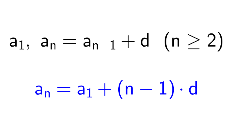 De forma recursiva podemos escribir una progresión aritmética con primer término a1 y diferencia d de esta forma: