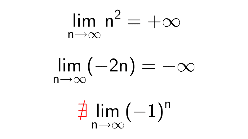 Nota: cuando escribimos *\lim_{n \to ∞} a_n=+∞* o *\lim_{n \to ∞} a_n=-∞,* no debe interpretarse que el límite existe, ya que el infinito no es un número real. Lo que estas expresiones indican es precisamente la razón por la cual el límite no existe: la sucesión crece o decrece sin límite. Por este motivo, conviene evitar expresiones como "la sucesión converge a infinito", ya que pueden generar confusión respecto al concepto de convergencia, el cual se reserva solo para límites finitos.